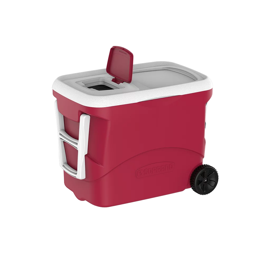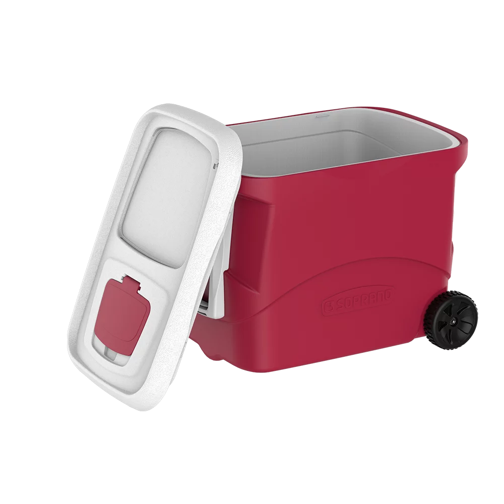Cooler 50 Litros com Rodas, isolamento em Poliuretano (PU), tampa exclusiva de acesso rápido, livre de Bisfenol (BPA Free), rodas para facilitar o transporte e acabamento robusto, ideal para seus clientes que buscam um cooler com maior litragem e uma melhor eficiência térmica em relação ao cooler de isopor (EPS).