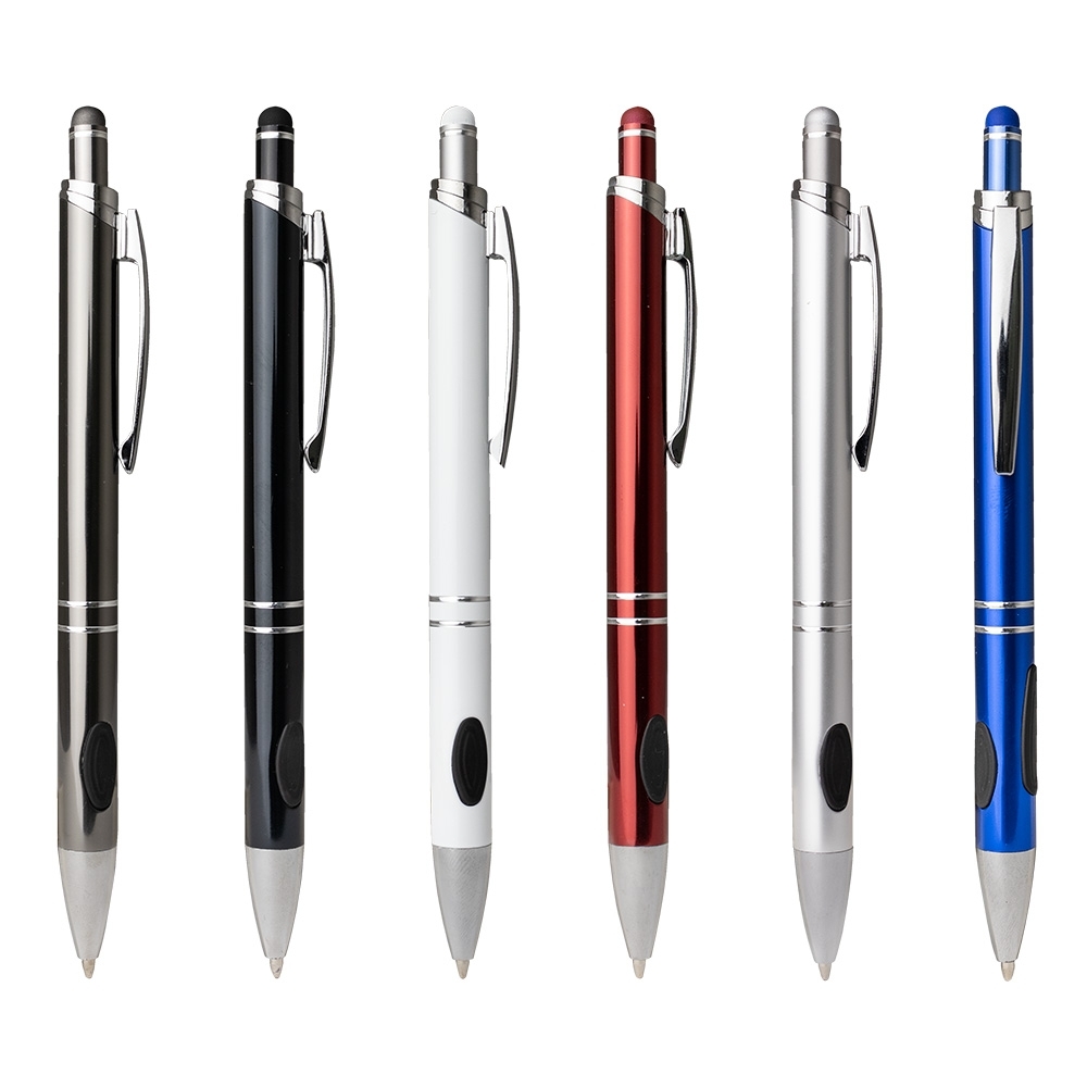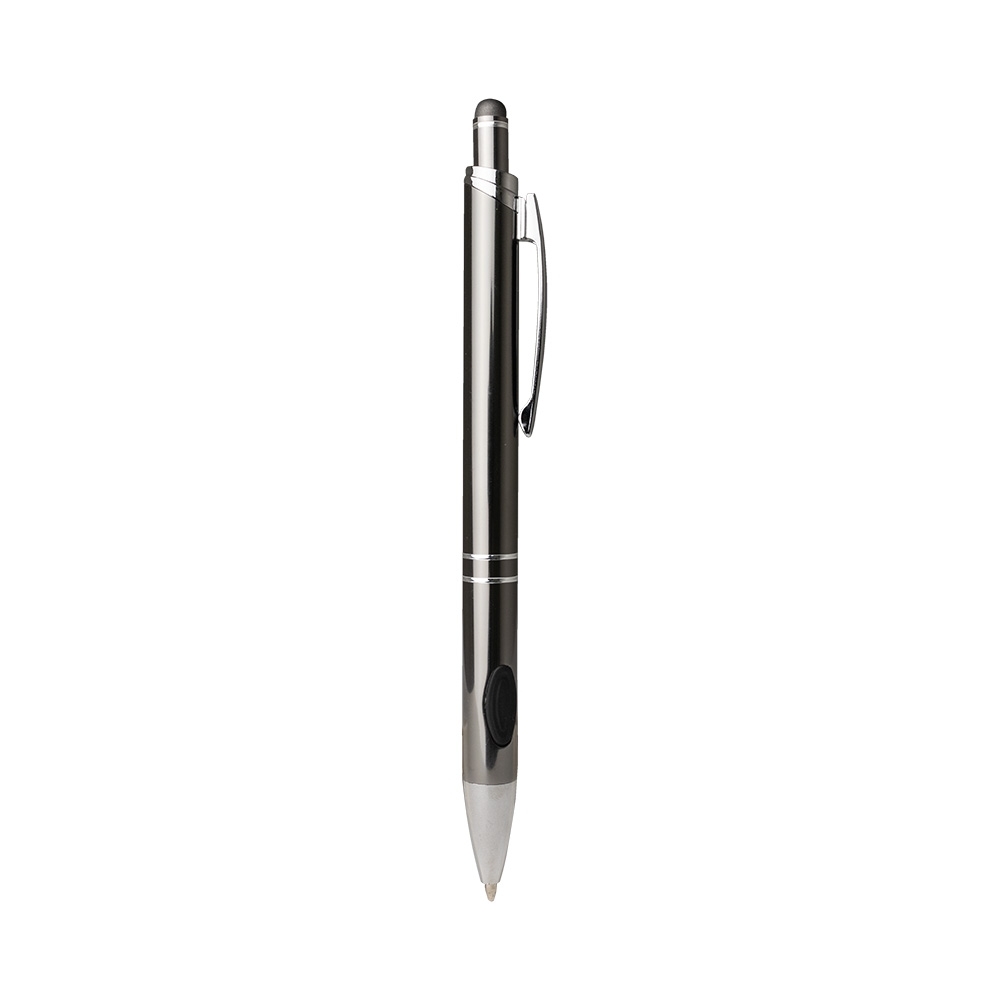 Descrição: Caneta metálica com touchscreen, com detalhe emborrachado na parte inferior, carga esferográfica azul de 1.0 mm e acionamento por clique.