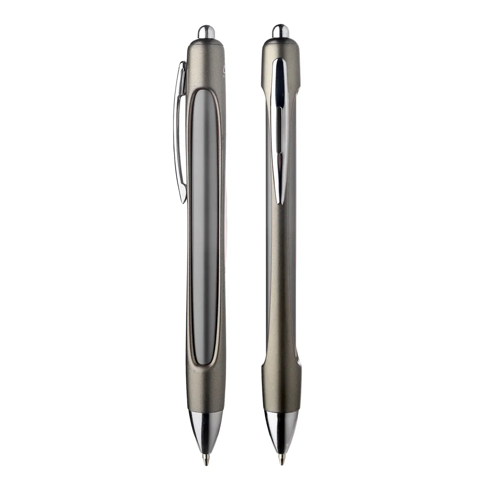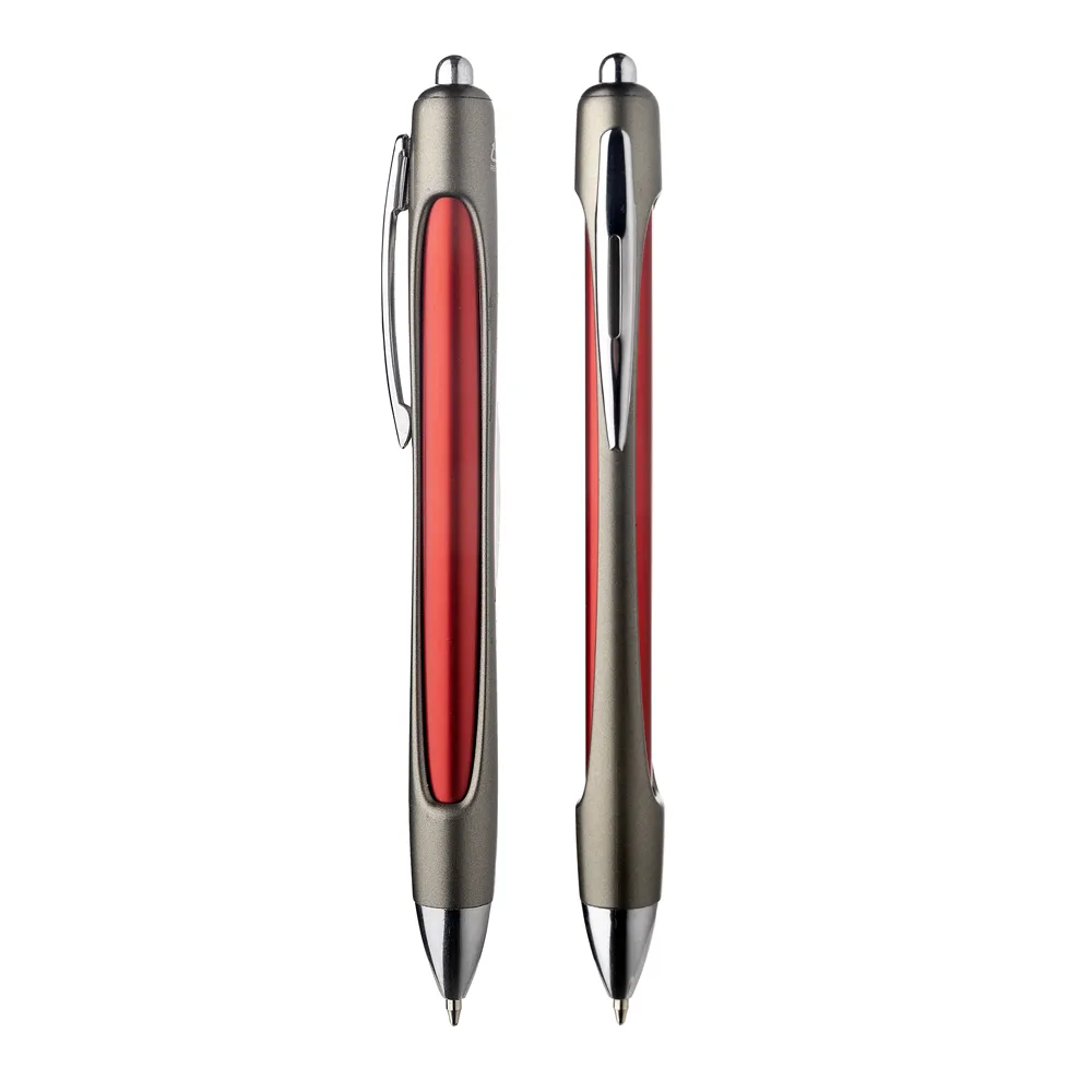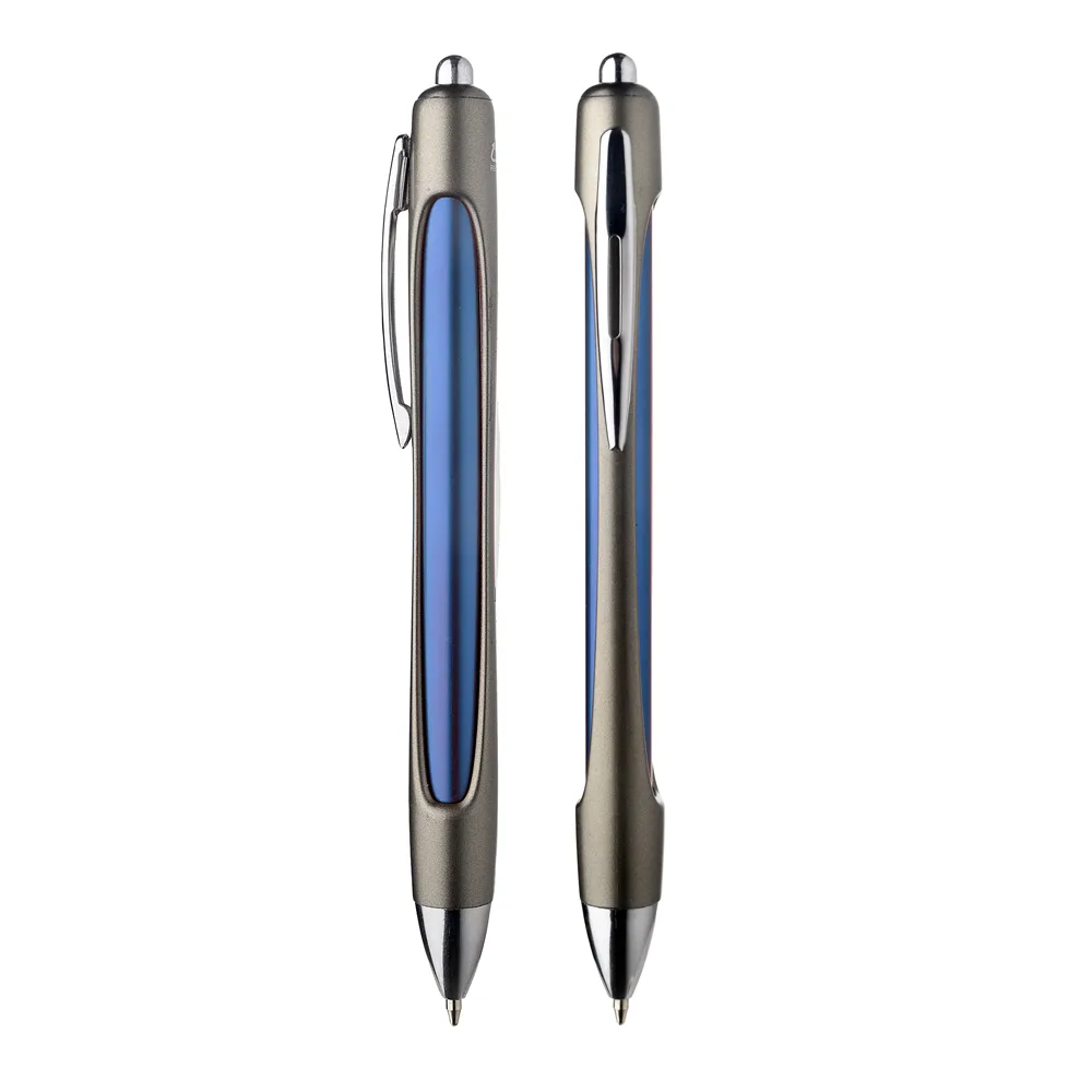 Caneta esferográfica em alumínio reciclavel com escrita em azul. Refil tipo parker.