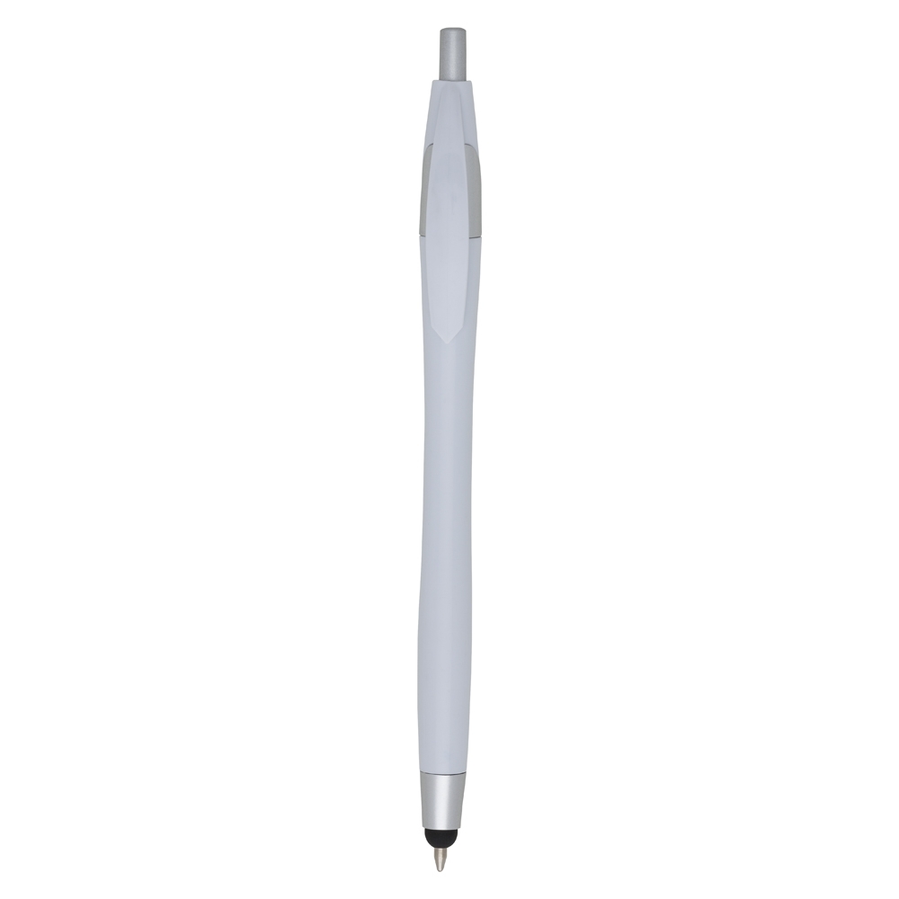 Descrição: Caneta plástica com ponteira touch screen, carga esferográfica azul e acionamento por clique.