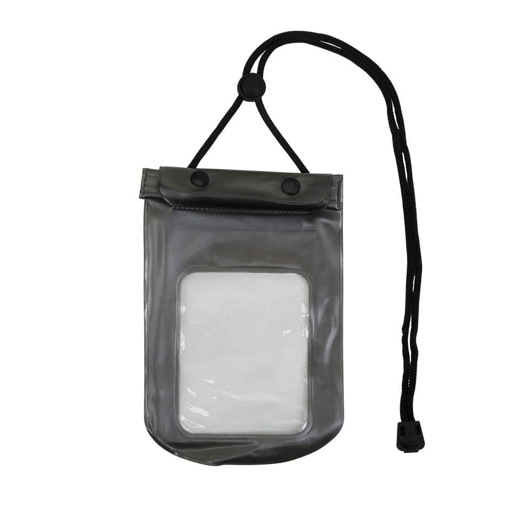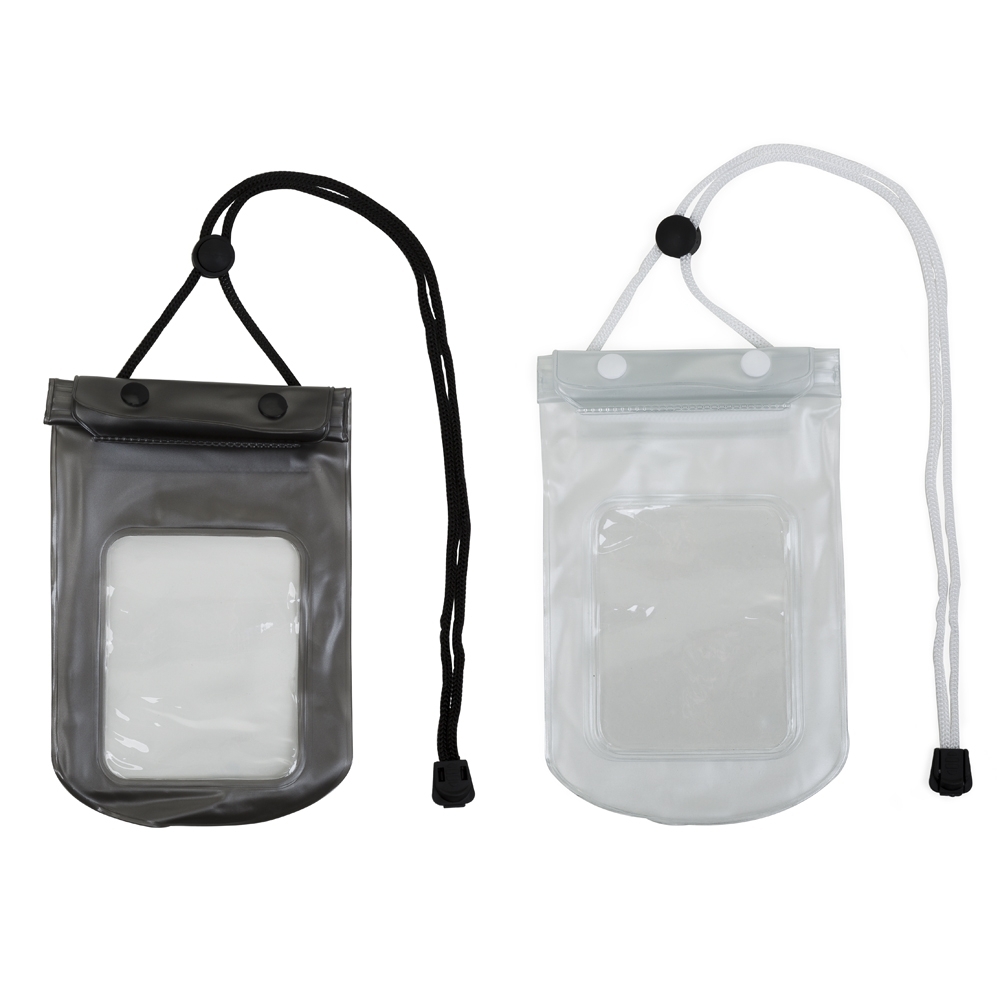 Descrição: Case impermeável para smartphone, fechamento á vácuo e através de abotoamento, com cordão de nylon, fabricado em PVC.