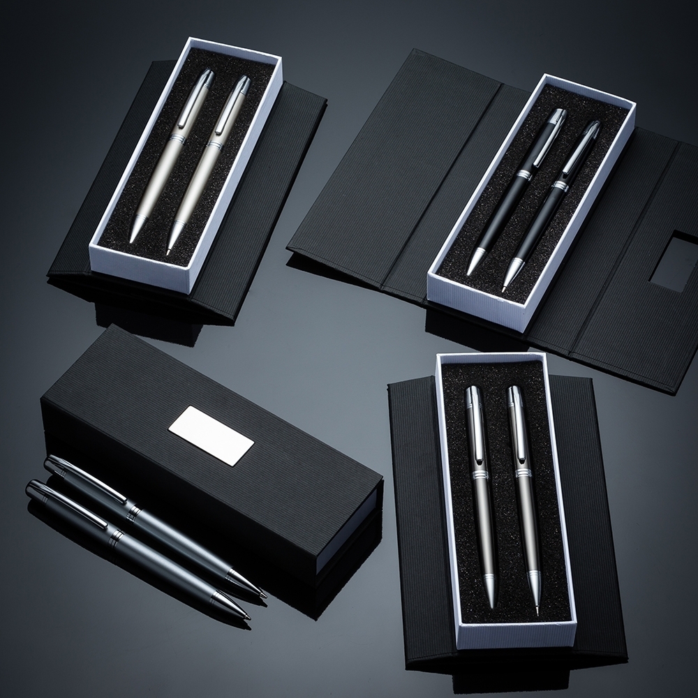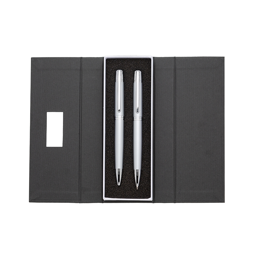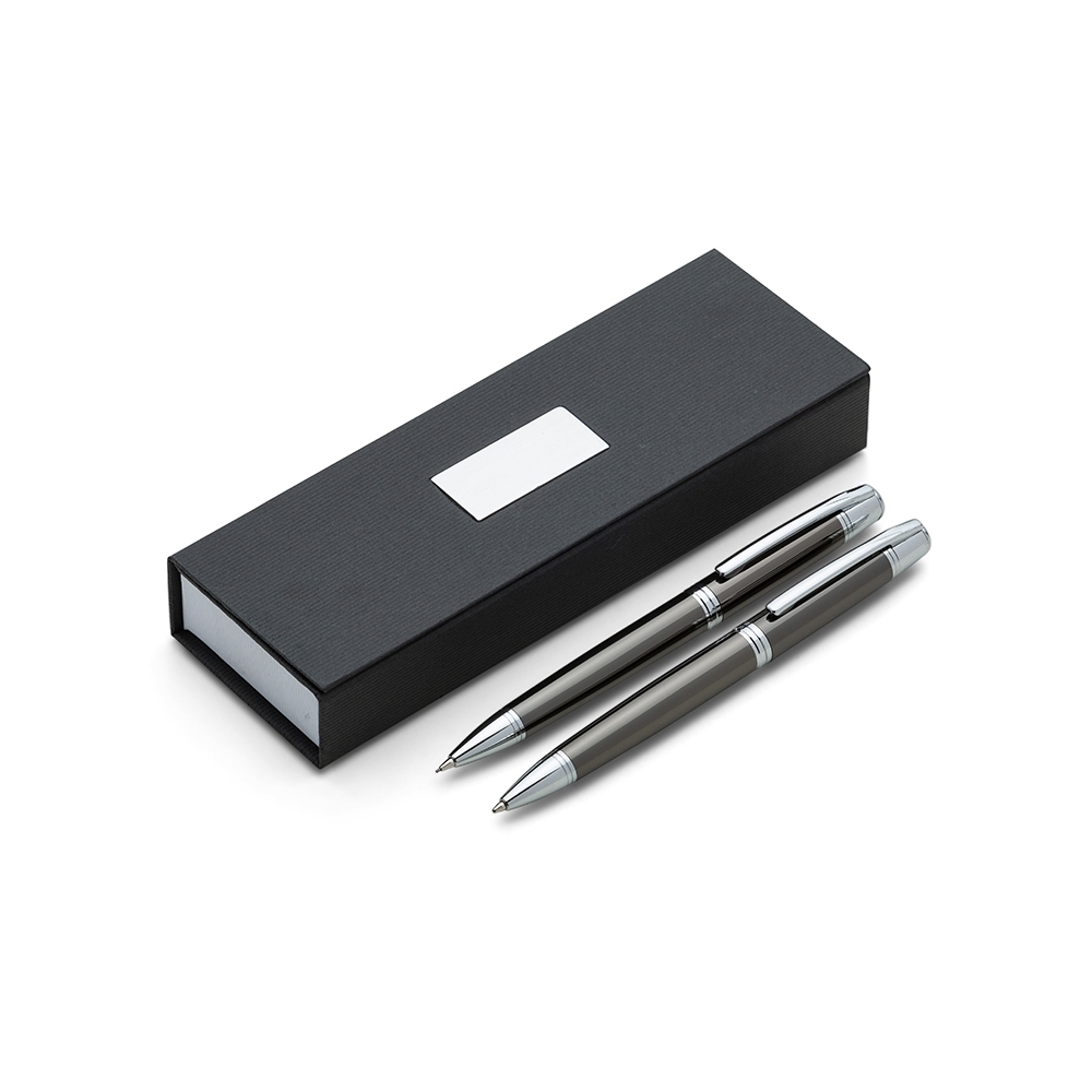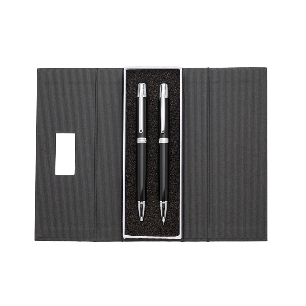 Descrição: Conjunto caneta e lapiseira em estojo de cartonagem com placa central para personalização. Clip metal com dois anéis em relevo, anel centralizado e dois anéis em relevo na ponteira e acionam por giro. Estojo revestida com espuma na parte interna.