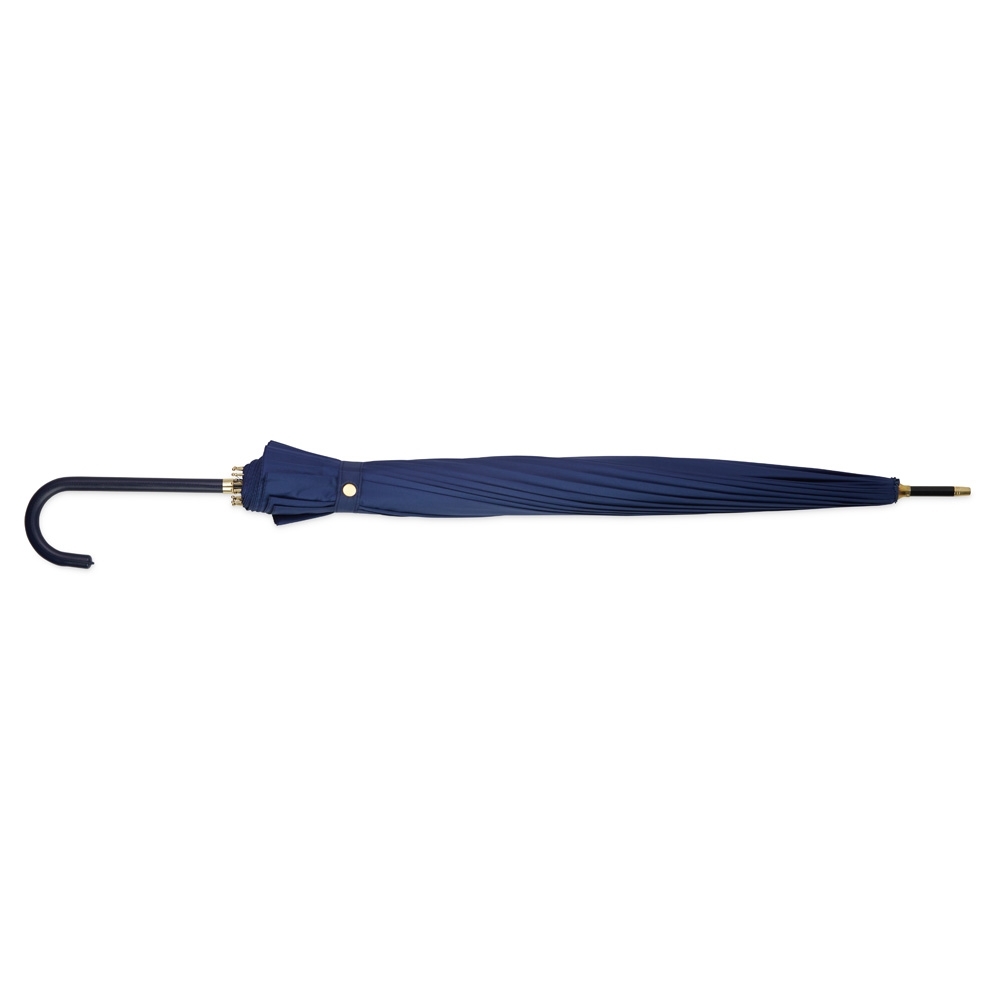 Descrição: Guarda-chuva de poliéster com abertura automática, estrutura em aço e 16 varetas em fibra de vidro. Possui pegador em couro sintético com botão de acionamento.