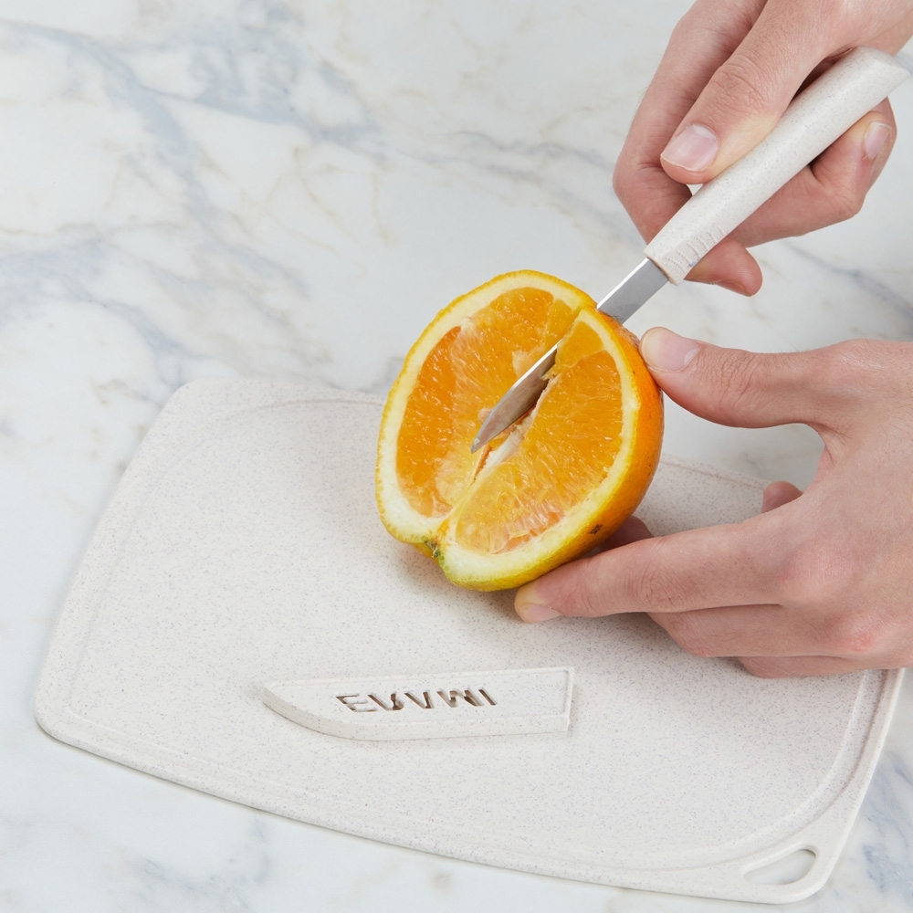 Descrição: Kit Cozinha 3 Peças em plástico de palha de trigo e inox. Contém tesoura culinária, faca com protetor e descascador de legumes. Acompanha bandeja e tampa, podendo ser utilizada como recipiente e tábua para corte.