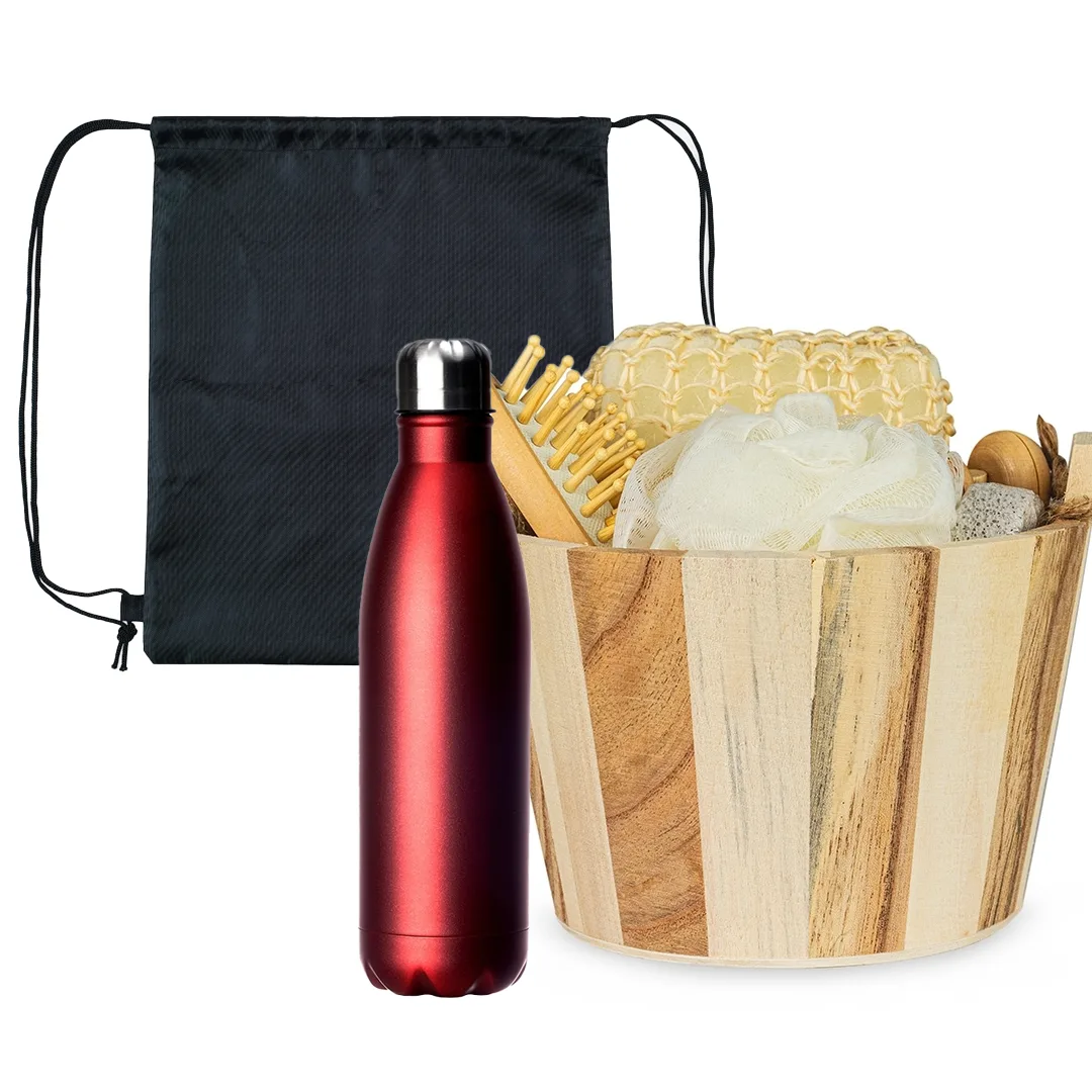 Kit banho com 6 peças. Inclui uma escova de madeira para os cabelos, uma pedra-pomes (utilizada para esfoliações, principalmente nos pés), um massageador de madeira facial, duas esponjas e, para completar, um balde de madeira com alça de corda (Cód: 15228)
