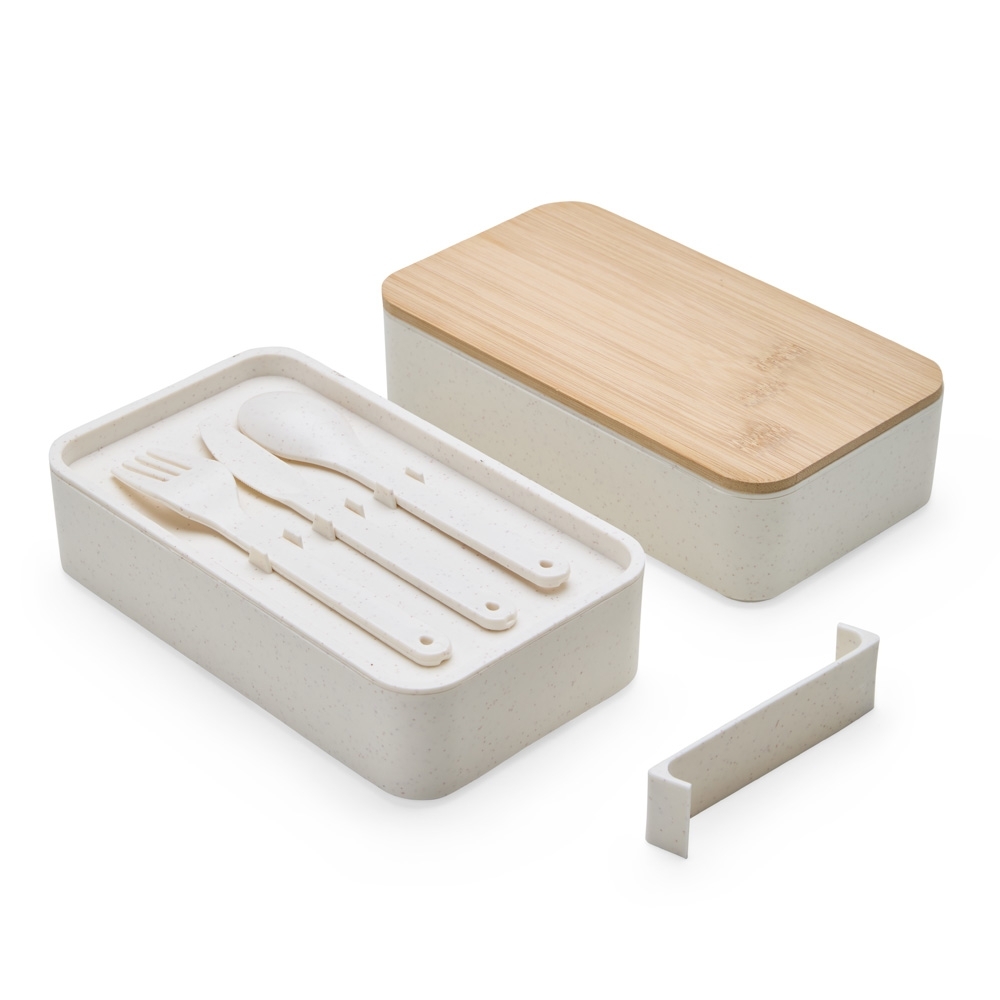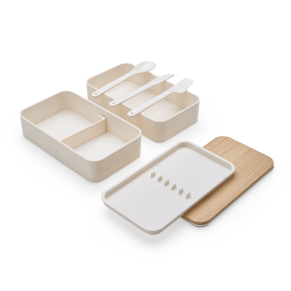 Descrição: Marmita dupla em fibra de trigo livre de BPA, sendo um compartimento de 600ml com tampa de bambu e outro compartimento de 500ml com suporte para talheres de fibra de trigo. Possui uma divisória removível e elástico para um transporte seguro. Acompanha garfo, faca e colher. Obs: O tempo de aquecimento no micro-ondas não deve ultrapassar 3 minutos.