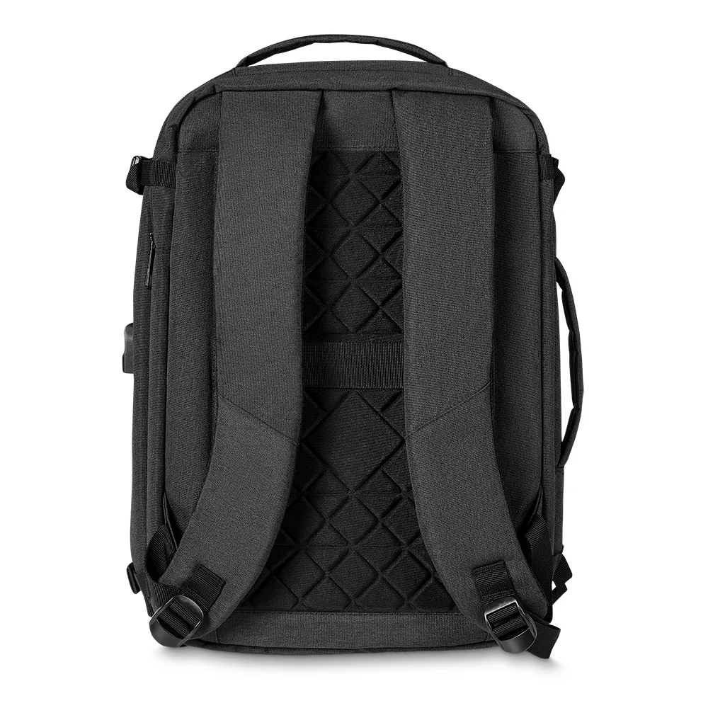 Conector USB e áudio P2 na lateral, ligado ao interior da mochila via cabos.