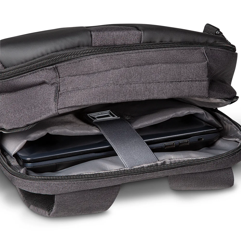 Mochila e Pasta para notebook em tecido poliéster 600D e detalhe em PU com interior em poliéster 210D.