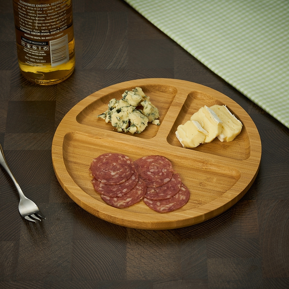 Descrição: Petisqueira de bambu pequena com 3 divisórias.
