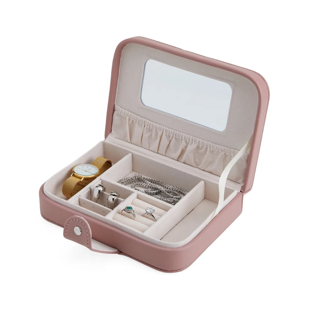 Descrição: Porta-joias em couro sintético com revestimento aveludado e espelho. Possui compartimentos internos para anéis, pulseiras, colares e placas para brincos.