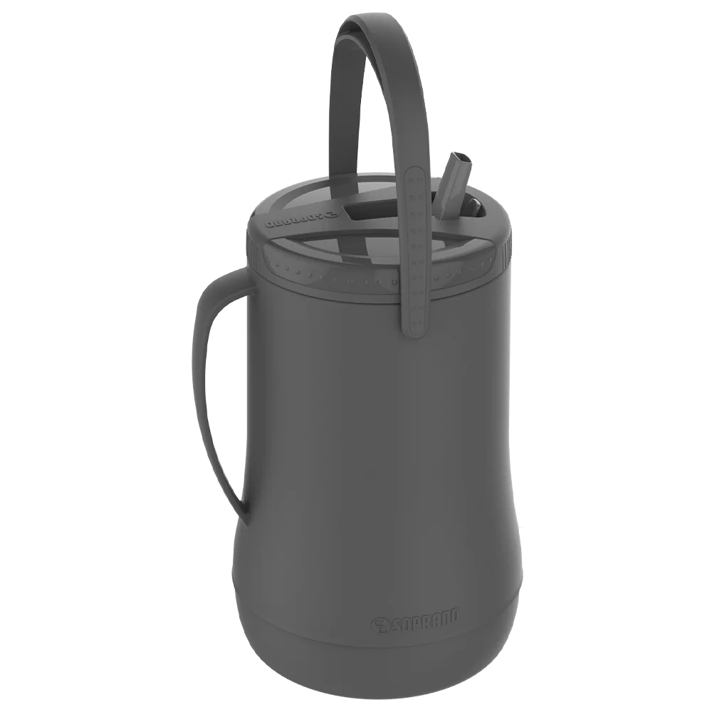 Garrafa Isotérmica 2,5L com sistema de bico retrátil e higiênico, alça para transporte, isolamento térmico em Poliuretano (PU) e alça para servir. Garrafa isotérmica ideal para manter bebidas geladas em acampamentos, pescarias, praias e viagens, seja para água, suco ou tereré. Produto livre de bisfenol (BPA Free), indicado para o uso com líquidos frios.