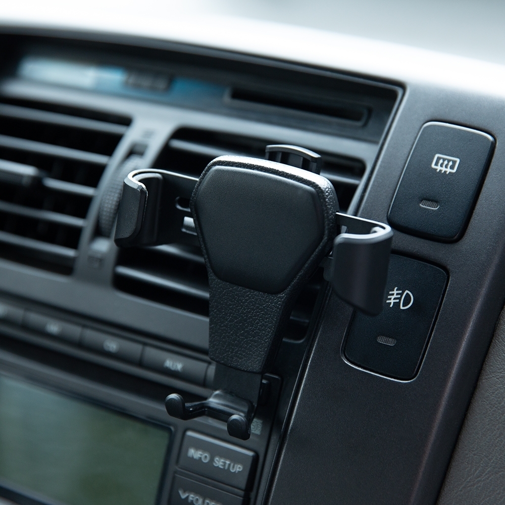 Descrição: Suporte veicular gravitacional com hastes de ajuste automático e garra de encaixe.